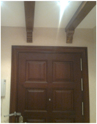 Trabajo de decoración con simulación de recibidor con sellería al fondo, acompañado con un paño de estuco sintético. Arco de pasta rústica combinada con puerta y bigas tintadas y paño de milleluchi: